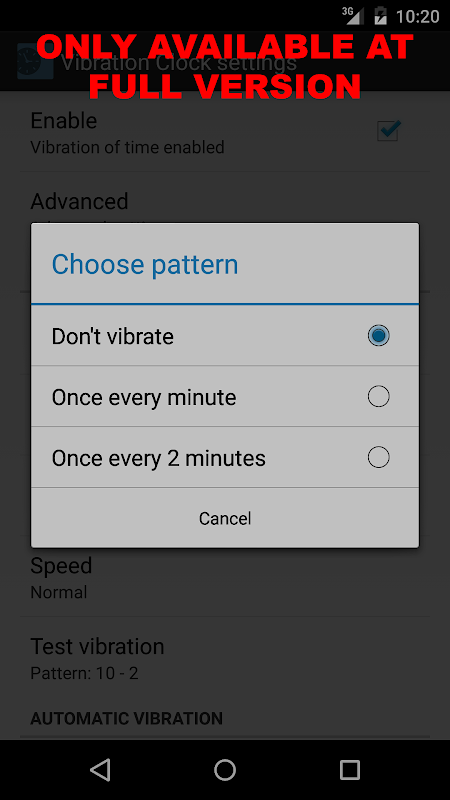 หากคุณต้องการตั้งค่ารูปแบบการสั่นสะเทือนโปรดซื้อนาฬิกาสั่นสะเทือน (ฉบับเต็ม) http://market.android.com/details?id=at.idsoftware.vibrationclock