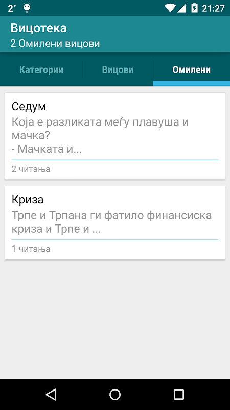 Read of-line more than 4500 jokes in Macedonian language from the best jokes web site in Macedonia vicoteka.mk. Read joke of the day, favorite jokes, share with your friends or browse jokes by categories. Update for new new jokes every once in a while.