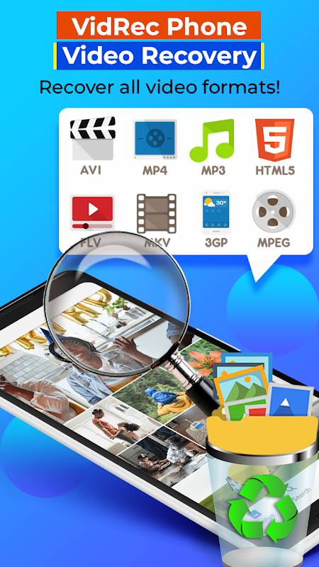 คุณอาจกำลังค้นหาแอปเพื่อกู้คืนวิดีโอที่ถูกลบ เนื่องจากคุณกังวลว่าจะเกิดกับโทรศัพท์ของคุณ เพื่อให้การเรียกคืนวิดีโอที่สูญหายหรือถูกลบจากโทรศัพท์ของคุณเป็นเรื่องง่าย เราจึงพัฒนา VidRec Phone Video Recovery ขึ้นมา โดยจะค้นหาโทรศัพท์เพื่อหาวิดีโอของคุณ ค้นหาวิดีโอที่ถูกลบ และให้คุณเรียกค้นวิดีโอเหล่านั้นได้อย่างรวดเร็วด้วยการคลิกเพียงครั้งเดียว ด้วย VidRec Phone Video Recovery ซึ่งเสร็จสมบูรณ์และสิ้นสุดในเวอร์ชันฟรีเมียม การกู้คืนข้อมูลจึงเป็นไปได้ มีความสามารถในการวิเคราะห์โทรศัพท์ทั้งหมดของคุณโดยอัตโนมัติก่อนที่จะกู้คืนแอปที่ถูกลบ