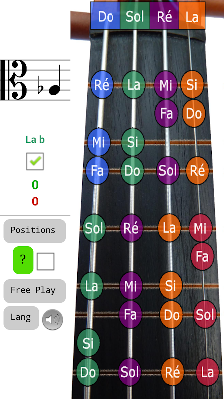 - Choice of notes to play : Choice of positions among 13 possible ones (from open string to 7th position), flat On/Off, sharp On/Off