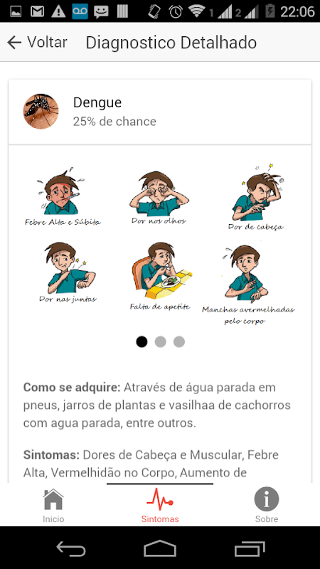 Para obter o pré-diagnóstico basta escolher a aba "Sintomas", marcar os sintomas que se está sentindo e clicar no botão "Diagnosticar" localizado no canto superior direito da tela. O aplicativo traz o percentual de chance de estar com uma doença que possua os mesmos sintomas informados pelo usuário.