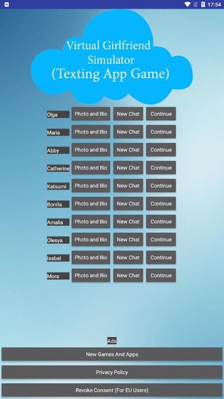 Virtual Girlfriend Simulator (Texting App Game) เป็นเกมฟรีที่จำลองแอปพลิเคชั่นแชทข้อความกับสาวโสดจากประเทศต่างๆ นี่เป็นโปรแกรมจำลองสำหรับผู้ชายที่กำลังจะได้รับประสบการณ์ในการจีบก่อนที่จะสมัครกับเว็บไซต์หาคู่จริง