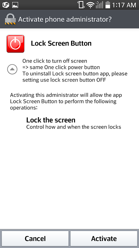 ถอนการติดตั้ง: ตั้งค่า> ความปลอดภัย> ผู้ดูแลระบบอุปกรณ์เพื่อปิดปุ่มล็อกหน้าจอ