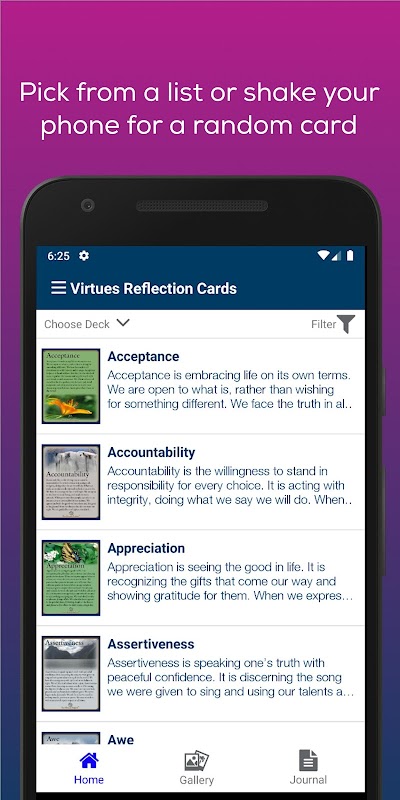 ** เลือกคุณธรรมที่เฉพาะเจาะจงหรือเขย่าโทรศัพท์เพื่อรับการ์ดแบบสุ่ม