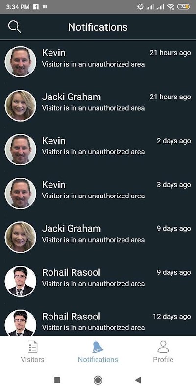 ระบบดังกล่าวมาพร้อมกับแอปพลิเคชั่น Visitor Tracker Mobile ซึ่งอุทิศให้กับเจ้าหน้าที่รักษาความปลอดภัยเพื่อติดตามผู้เยี่ยมชมทั้งหมดภายในอาคาร แอพนี้ยังมีการแจ้งเตือนและการแจ้งเตือนสำหรับผู้เข้าชมทั้งหมด เช่นการแจ้งเตือนการเคลื่อนไหวที่ไม่ได้รับอนุญาตและการแจ้งเตือนสำหรับผู้เข้าชมทั้งหมดมากกว่าการอยู่ภายในอาคาร นอกจากนี้ยังให้รายชื่อผู้เยี่ยมชมทั้งหมดที่อยู่ภายในอาคารและรายชื่อผู้เยี่ยมชมที่จะมาเยี่ยมชม เจ้าหน้าที่รักษาความปลอดภัยสามารถมีรายละเอียดของผู้เข้าชมได้ด้วยการคลิกเพียงครั้งเดียวผ่านทางแอพมือถือ