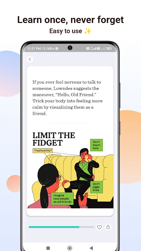 เรียนรู้ในเวลาเพียงไม่กี่นาทีต่อวัน: ด้วยบทขนาดพอดีคำที่ใช้เวลาสองนาทีหรือน้อยกว่านั้นในการทำให้สำเร็จ คุณสามารถบูรณาการการเรียนรู้เข้ากับตารางงานที่ยุ่งของคุณได้อย่างราบรื่น ไม่ว่าคุณจะเดินทาง พักร้อน หรือพักผ่อนในแต่ละวัน VisualMind ช่วยให้การเติบโตเป็นเรื่องง่าย