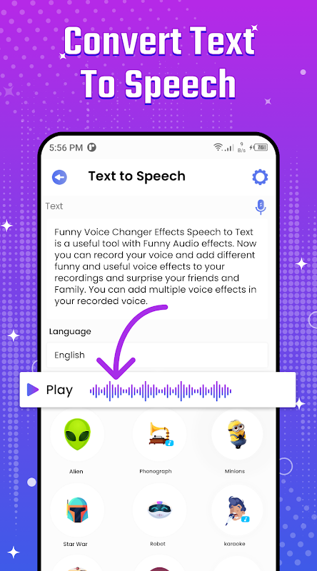 เอฟเฟกต์ตัวเปลี่ยนเสียงตลก - คำพูดเป็นข้อความเป็นเครื่องมือที่มีประโยชน์พร้อมเอฟเฟกต์เสียงตลก ตอนนี้คุณสามารถบันทึกเสียงของคุณและเพิ่มเอฟเฟกต์เสียงตลกและมีประโยชน์ต่าง ๆ ให้กับการบันทึกของคุณและทำให้เพื่อนและครอบครัวของคุณประหลาดใจ คุณสามารถเพิ่มเอฟเฟกต์เสียงได้หลายแบบในเสียงที่คุณบันทึก เช่นเดียวกับคุณสามารถเพิ่มเอฟเฟกต์คาราโอเกะ เอฟเฟกต์เสียงผู้หญิง เอฟเฟกต์ถ้ำ และเอฟเฟกต์เสียงชายชรา