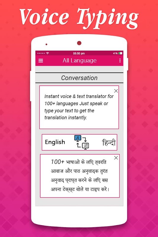 6.) Multilingual typing: - Now speak in one language and display it in another languages font easily. For e.g.: - Speak in Hindi and see it being displayed in English font just like magic. This makes this app great for messaging apps.