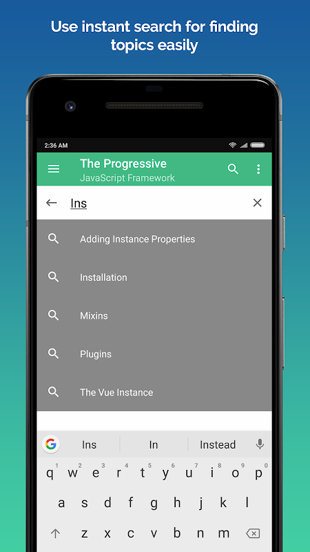 You can find topics using the instant search by selecting the search icon in the app bar.