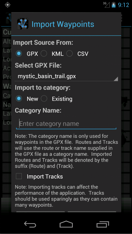 หากคุณมีข้อมูลที่เก็บไว้ในสถานที่ Waypoint รูปแบบ GPX สามารถนำเข้าข้อมูลของคุณโดยอัตโนมัติและจัดหมวดหมู่เป็น waypoints, เส้นทางและแทร็ค หรือถ้าคุณมีข้อมูลสถานที่ที่อยู่ในรูปแบบ KML Waypoint สามารถนำเข้าได้เช่นกัน