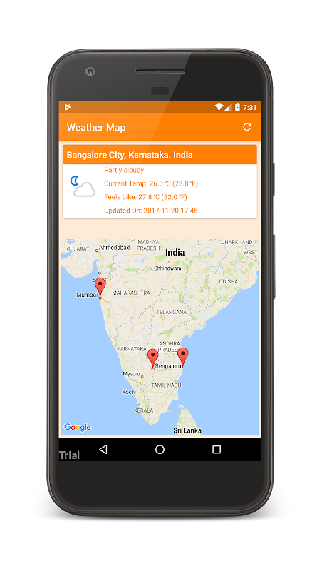 A simple Android application which demonstrates networking in Android using best practices, to retrieve weather information from open API. Integrated with Google Maps API for setting up markers on map.