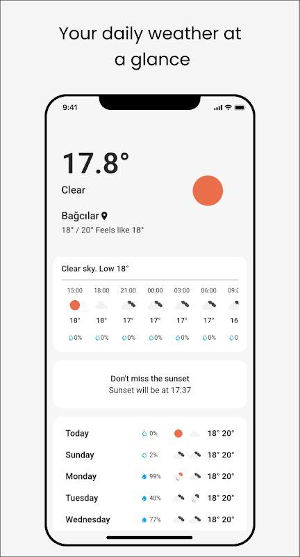 แอปสภาพอากาศช่วยให้คุณวางแผนสัปดาห์ได้อย่างมั่นใจโดยให้การพยากรณ์รายวันที่ครอบคลุมสำหรับ 7 วันข้างหน้า การคาดการณ์โดยละเอียดนี้ประกอบด้วย: