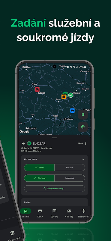 แอปพลิเคชั่นให้ข้อมูลล่าสุดเกี่ยวกับสถานะและตำแหน่งของยานพาหนะพร้อมความเป็นไปได้ในการแสดงบนแผนที่ ตามการเคลื่อนที่ของยานพาหนะและพิกัด GPS ระบบจะบันทึกสมุดบันทึกอิเล็กทรอนิกส์โดยอัตโนมัติ รวมถึงแบ่งออกเป็นการเดินทางเพื่อธุรกิจและส่วนตัว นอกจากนี้ แอปพลิเคชันยังมีการบันทึกต้นทุน - สามารถกรอกใบเสร็จรับเงินสำหรับการเติมน้ำมัน การล้าง หรือการบริการลงในแอปพลิเคชันได้อย่างง่ายดาย จากนั้นจึงโอนแบบดิจิทัลไปยังซอฟต์แวร์บัญชีของคุณ สุดท้ายนี้ แอปพลิเคชันช่วยให้คุณสามารถฝากข้อความถึงผู้จัดการกลุ่มยานพาหนะ ผู้มอบหมายงาน หรือผู้ใช้ยานพาหนะรายอื่นได้