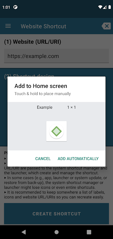 การสร้างทางลัดทำได้โดยส่งการออกแบบทางลัด (ป้ายกำกับ/ไอคอน) และความตั้งใจกับเว็บไซต์ (URL/URI) ไปยังตัวจัดการทางลัดของระบบและตัวเรียกใช้งาน ตัวจัดการช็อตคัทของระบบและตัวเรียกใช้งานสร้างและจัดการช็อตคัท และรักษาไว้ด้วย Intent ที่เกี่ยวข้อง ในบางกรณี (เช่น เมื่อแอป ตัวเรียกใช้งานหรืออัปเดตระบบ หรือกู้คืนจากการสำรองข้อมูล) ตัวจัดการทางลัดหรือตัวเรียกใช้งานระบบอาจสูญเสียไอคอนของทางลัดที่มีอยู่ หรือแม้แต่ทางลัดทั้งหมด ขอแนะนำให้เก็บรายการป้ายกำกับ ไอคอน และ URL ของเว็บไซต์ไว้ที่ใดที่หนึ่ง เพื่อให้คุณสามารถสร้างใหม่ได้อย่างง่ายดาย ในเมนูลิ้นชักแอป คุณสามารถเปิด "ทางลัดปัจจุบัน" ซึ่งแสดงป้ายกำกับและ URL ของเว็บไซต์/URI ของทางลัดที่ยังคงมีอยู่ซึ่งดึงมาจากตัวจัดการทางลัดของระบบ