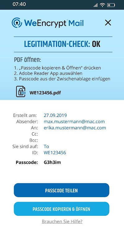 - รหัสผ่าน (รหัสผ่าน) สำหรับการถอดรหัสจะถูกส่งผ่าน WeEncrypt Mail ไม่ว่าจะเป็นอีเมลแยกต่างหากหรือถ้าผู้รับลงทะเบียนแล้วผ่าน WeEncrypt Mail
