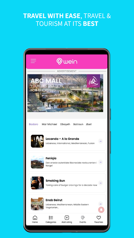 Wein เป็นคู่มือที่ดีที่สุดสำหรับผู้ใช้ในการสำรวจเลบานอนอย่างที่ไม่เคยมีมาก่อน เป็นแอปบนอุปกรณ์เคลื่อนที่แบบไดนามิกและครอบคลุมทุกอย่างซึ่งทำหน้าที่เป็นโซลูชันไปสู่การเข้าถึงบริการทุกอย่างเท่าที่จะเป็นไปได้ในประเทศ
