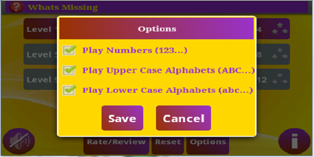 สิ่งที่ขาดหายไปเป็นวิธีการเรียนรู้ตัวเลขและลำดับตัวอักษรที่ง่ายและสนุก ผู้เล่นย้ายไปยังระดับถัดไปโดยการกรอกจำนวนเกมที่ถูกต้องขั้นต่ำ หลังจากแต่ละเกมผู้เล่นจะแสดงสถิติของระดับเช่นจำนวนครั้งที่ชนะและเปอร์เซ็นต์ที่ชนะ สิ่งนี้กระตุ้นให้ผู้เล่นก้าวต่อไปเพื่อความสำเร็จที่สูงขึ้น