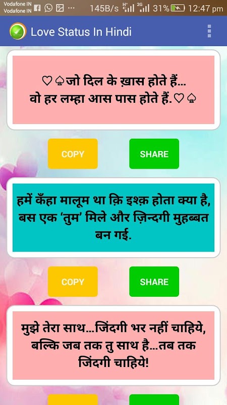 User can daily set the unique status message in their Whatsapp and Facebook and other Social Sites.Application contain best and Latest Shayari, Status and Messages..!