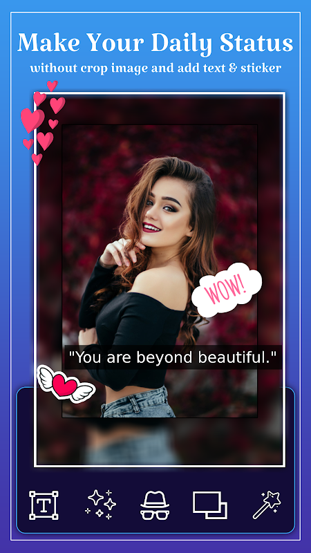 แอพนี้ให้สถานะสำเร็จรูปใหม่ทุกวันเพื่อตั้งค่าบนโซเชียลมีเดีย เช่นเดียวกับรูปโปรไฟล์ของคุณคุณสามารถสร้างสถานะได้โดยไม่ต้องครอบตัดรูปภาพของคุณ