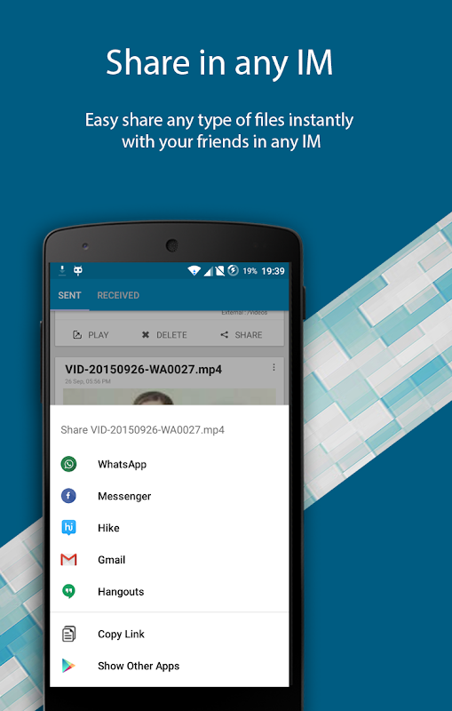 ☆ Any File Type: Share any type of file including installed apps, APKs, Archives, Docs, EBooks, Music, Images, Videos of up to 1 GB via any Instant messaging app installed in your phone.