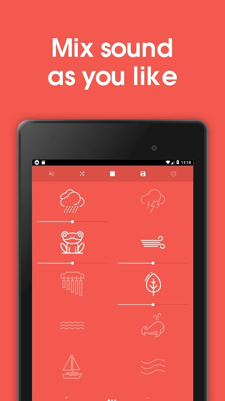 สนับสนุน app นี้คุณสามารถสร้างเสียงสีขาวที่คุณชื่นชอบโดยการเลือกและการผสมเสียงบางส่วนของฝนฟ้าคะนองลม, ป่ากับนก, Steam น้ำซีไซด์สถานที่ดับเพลิงในคืนฤดูร้อน ... app นี้ยังสนับสนุนให้คุณสามารถปรับระดับเสียงของ เสียงบางอย่าง