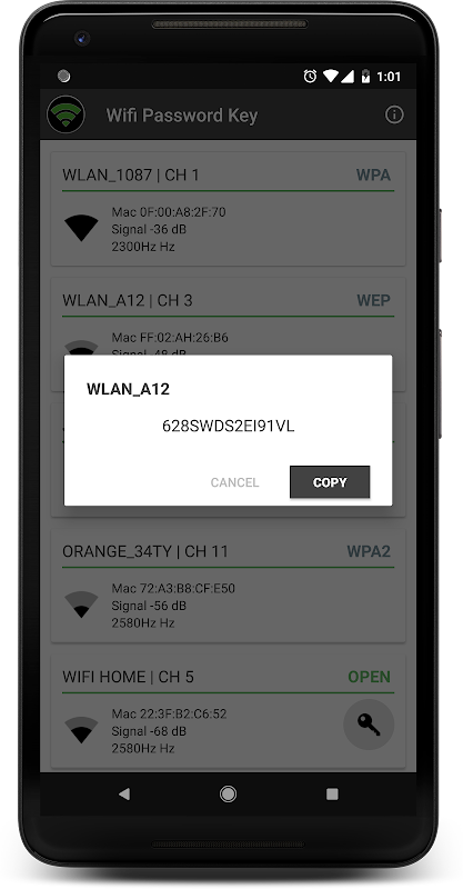 In wifi list you can see information such as SID, MAC, channel, frequency and intensity.