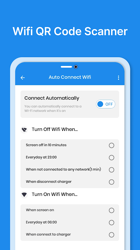 ด้วยแอป Wi-Fi Auto Connect หน้าจออุปกรณ์เปิดอยู่ WiFi จะได้รับการเชื่อมต่อ เมื่ออุปกรณ์กำลังชาร์จ WiFi จะได้รับการเชื่อมต่อ และเมื่อผู้ใช้เปิดแอปที่ต้องการ WiFi จากนั้น WiFi ก็จะเชื่อมต่อโดยอัตโนมัติด้วย เมื่ออุปกรณ์อยู่นอกช่วง WIFi และแอพไม่จำเป็นต้องใช้ WiFi จากนั้น WiFi จะถูกปิดโดยอัตโนมัติ เปิด/ปิด WiFi อัตโนมัติ (ไม่รองรับอุปกรณ์ Android 10 ขึ้นไป)