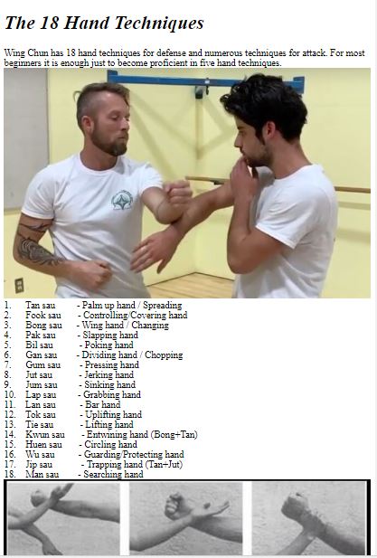 การบล็อกและการปัดป้อง: เรียนรู้เทคนิคการบล็อกและการปัดป้องต่างๆ เพื่อเบี่ยงเบนการโจมตีที่เข้ามา เทคนิคต่างๆ ได้แก่ Tan Sau (ฝ่ามือยกขึ้น), Bong Sau (Wing Arm) และ Fook Sau (มือควบคุม)