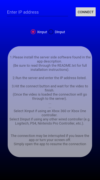 • Enter the IP Address shown in the server application and hit the connect button on your phone