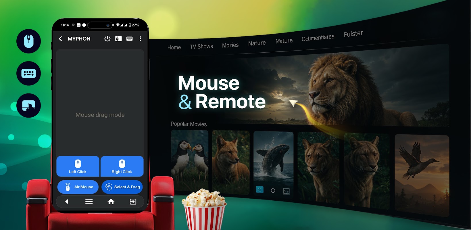 • การควบคุมเคอร์เซอร์ที่ราบรื่น ฟังก์ชันคลิกซ้ายและขวา และท่าทางการเลื่อน ทั้งหมดนี้ทำได้จากหน้าจอสัมผัสของอุปกรณ์ของคุณ • เมาส์อากาศที่เคลื่อนไหวได้เพื่อโต้ตอบกับพีซีหรือแล็ปท็อปของคุณจากระยะไกล