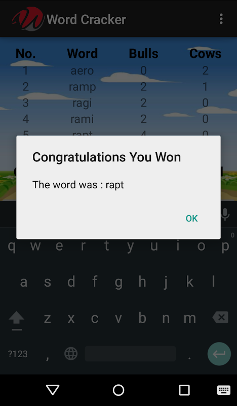 The main aim of the game is to guess the word that the game generated randomly. The game will show number of cows and bulls(meaning of cows and bulls explained below) on each word you enter. You have to get 4 bulls in order to win.