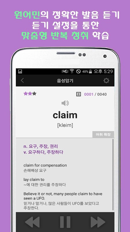 3. 음성암기 : 총 2000단어에 대한 원어민 음성을 통해 정확한 발음 듣기는 물론 반복 청취 학습 및 암기가 가능합니다. 또한 듣기설정을 통해 맞춤 듣기 학습이 가능합니다.