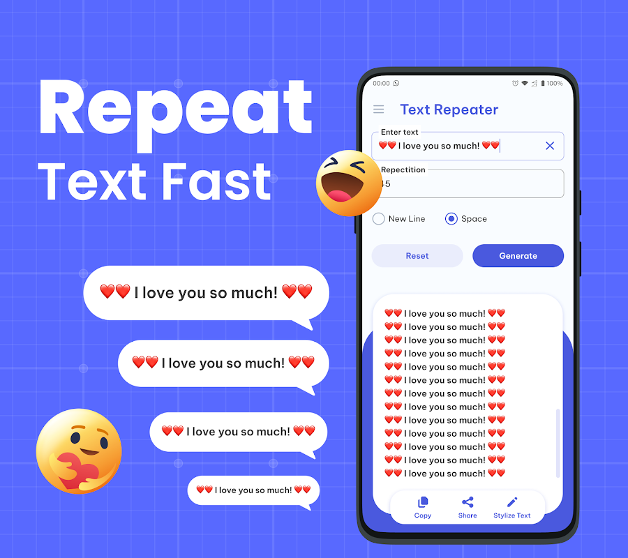 พบกับ Word Repeater: Style Text Gen - แอปส่งข้อความซ้ำแบบครบวงจรที่ให้คุณทำซ้ำ สับเปลี่ยน และจัดแต่งข้อความได้ภายในไม่กี่วินาที ไม่ว่าคุณจะต้องการสร้างแชทที่ไม่เหมือนใคร ส่งข้อความตลกๆ จำนวนมาก หรือแค่ประหยัดเวลา แอป Word Repeater & Text Generator นี้มีทุกสิ่งที่คุณต้องการ