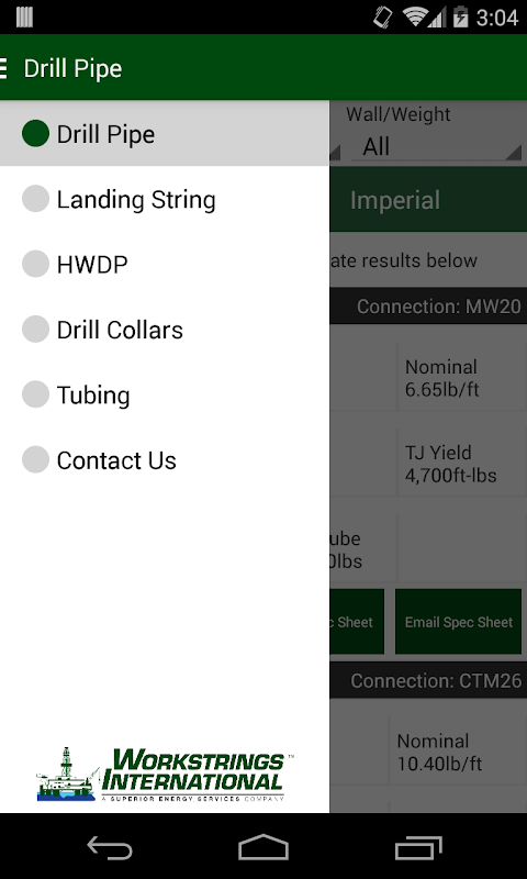The App allows users to access specifications for the most commonly used sizes and connections of drill pipe, landing string, HWDP, drill collars and tubing providing the option to view and email specification sheets conveniently using your mobile device.