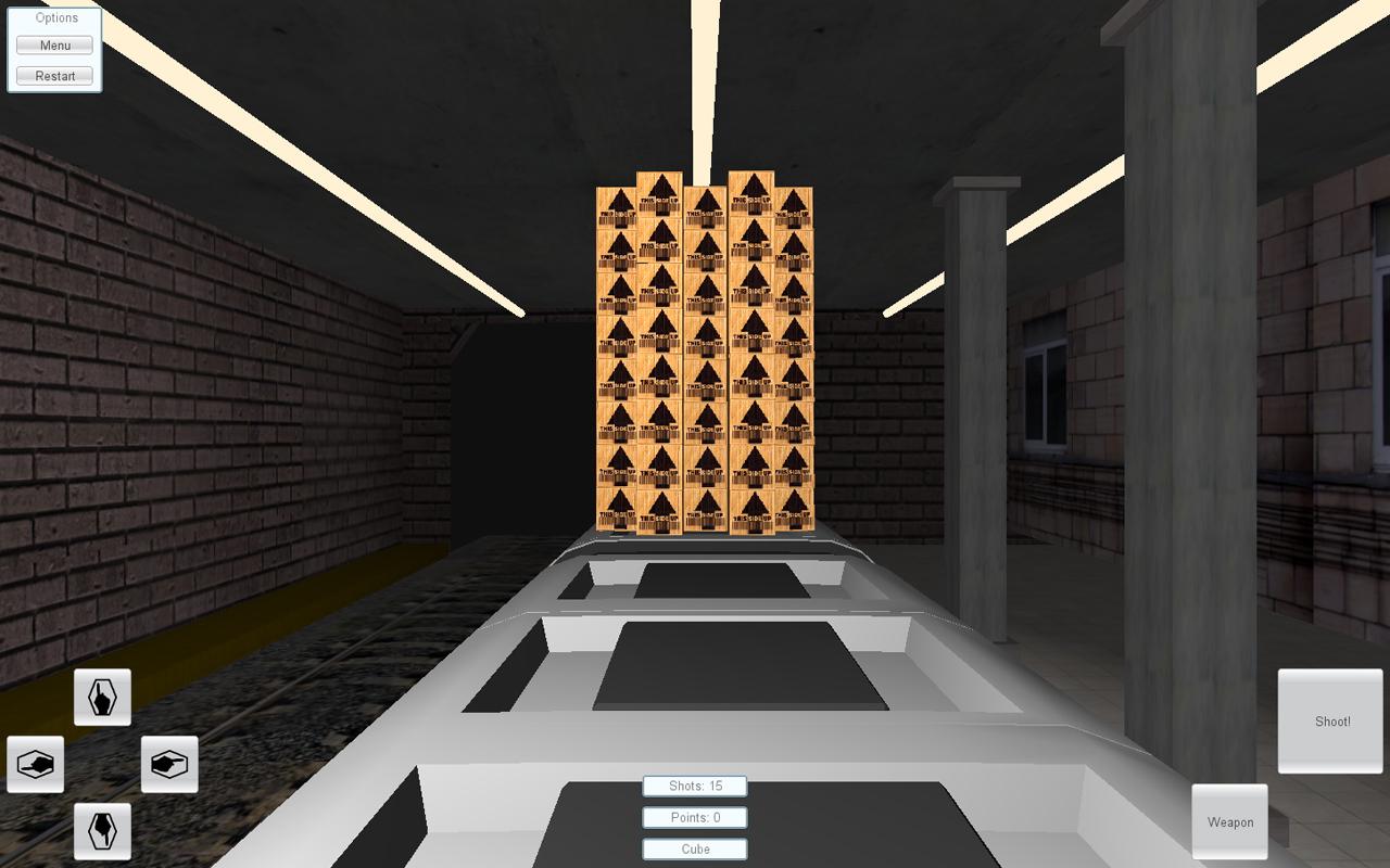 Finally, we’ve brought the full version of our game. It’s really a quite simple game. It’s based on a realistic and accurate physics simulation system. All boxes must fall from the platform. You have 15 shots to accomplish that objective. Each fallen box is worth for 100 points divided by the shots you've made. At the end each unused shot adds 200 points two the result.