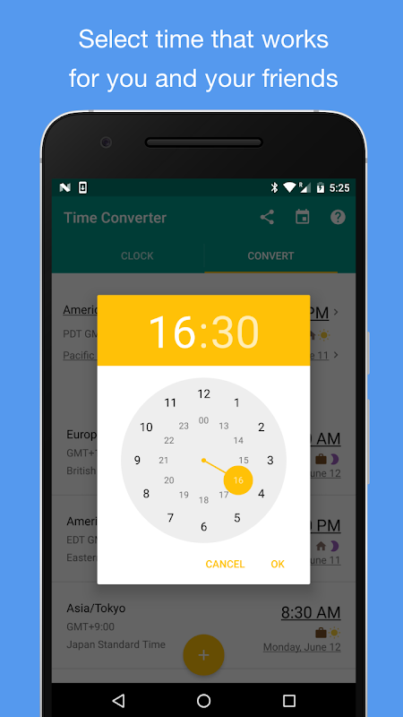 Get family, friends or co-worker from all over the world? Then this simple and beautiful Android app is a must-have application. Before you schedule a Skype/Whatsapp call with your family or friends, or schedule a meeting with a co-worker in another city, make sure you use this app to select the perfect time for everyone!