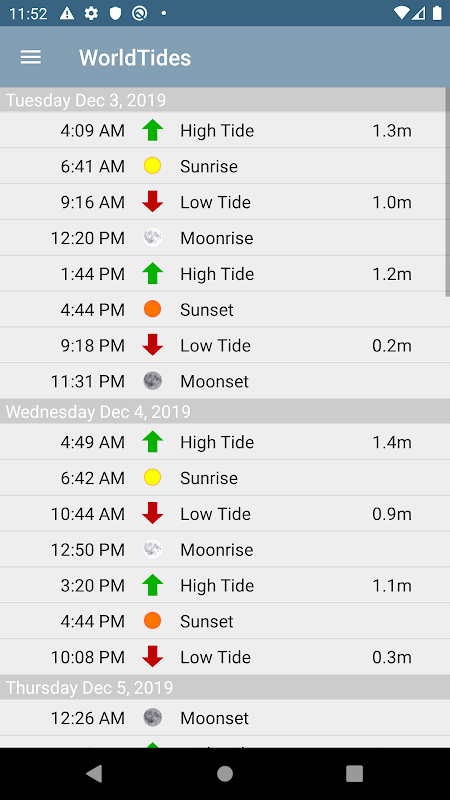 WorldTides ให้การคาดการณ์ระดับน้ำขึ้นน้ำลงเป็นเวลา 7 วันเป็นเวลา 1 ปีในสถานที่ต่างๆ กว่า 5,800 แห่งทั่วโลก แหล่งข้อมูลประกอบด้วย UKHO, NOAA และการทำนายดาวเทียม สถานที่เหล่านี้กว่า 5,000 แห่งมีอยู่แล้วภายใน ดังนั้นจึงไม่จำเป็นต้องเชื่อมต่ออินเทอร์เน็ต ซอฟต์แวร์นี้ยังมีแผนที่ในตัวที่รวดเร็ว ดังนั้นคุณจึงไม่ต้องรอดาวน์โหลดรูปภาพ
