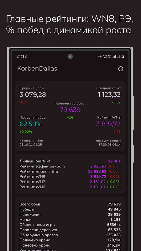 - ติดตามการให้คะแนนที่สำคัญทั้งหมด: WN8, การให้คะแนน WGR, RE (EFF), WN7, WN6, Bronesite (BR) ค้นหาจุดแข็งและจุดอ่อนของคุณ