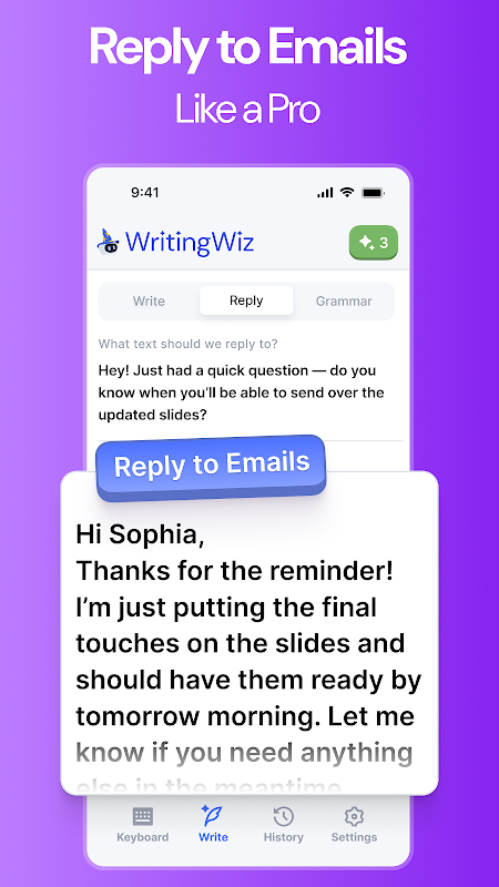 WritingWiz ช่วยให้คุณเขียนข้อความที่ชัดเจน กระชับ และสวยงาม เพื่อสร้างความประทับใจอย่างโดดเด่น สร้างอีเมล เรื่องราว ข้อความ และอื่นๆ ได้อย่างมืออาชีพและทรงพลังได้อย่างง่ายดาย