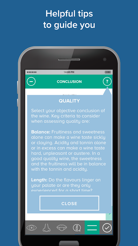 มาถึงคุณโดย Wine & Spirit Education Trust (WSET) ซึ่งเป็นผู้ให้บริการการศึกษาด้านไวน์ที่ใหญ่ที่สุดในโลก - แอพนี้ขึ้นอยู่กับระบบที่เป็นที่ยอมรับทั่วโลกถึงTasting® (SAT) ระดับ 2