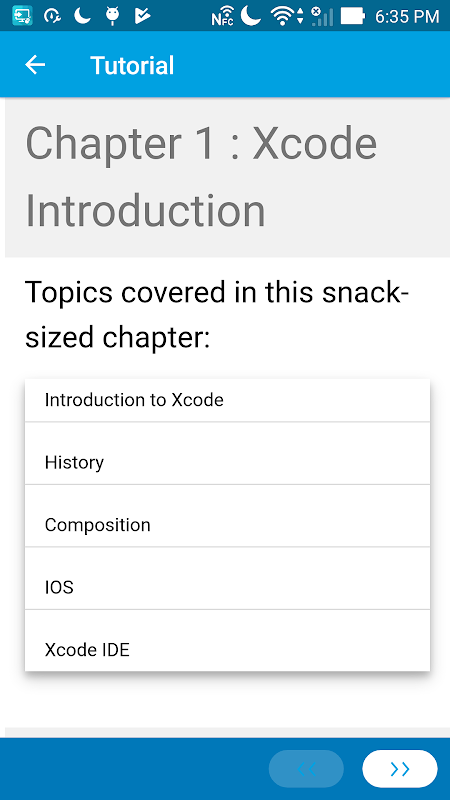 You have limited access to the content provided. For full access to the content, please login and purchase this application. This app provides a quick summary of essential concepts in Xcode by following snack sized chapters: