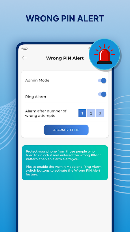 ◆ การแจ้งเตือน PIN ผิด: ปกป้องโทรศัพท์ของคุณจากผู้ที่พยายามปลดล็อคและป้อน PIN หรือรูปแบบที่ไม่ถูกต้อง จากนั้นนาฬิกาปลุกจะแจ้งเตือนคุณ