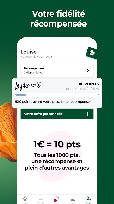 - ทุกๆ 1,000 คะแนน คุณจะได้รับรางวัลที่คุณเลือก: บัตรกำนัล ผลิตภัณฑ์ฟรี หรือต้นไม้ที่ปลูกโดยโครงการ Plant for Life ของมูลนิธิ Yves Rocher