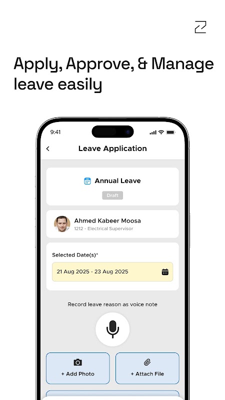 Zaper Staff is a workforce management app designed for construction field workers. It helps track attendance efficiently using face recognition. Users can log in with their mobile number, update their profile photo, and register their face with five-angle photos. The app allows daily check-ins and check-outs, showing total work time and any applicable late fines.