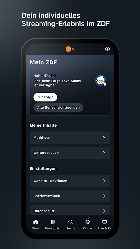 - ZDF ของฉัน: สร้างรายการเฝ้าดูส่วนตัวของคุณและรับการแจ้งเตือนเกี่ยวกับตอนใหม่ ไม่พลาดไฮไลท์อีกต่อไปด้วยคำแนะนำอันชาญฉลาดและออกแบบประสบการณ์การสตรีมส่วนบุคคลของคุณ