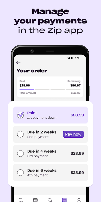 Enter the amount you’d like to spend (including any taxes or shipping costs!). Your purchase will be split into 4 payments over 6 weeks¹, taking the worry and hassle out of shopping by allowing you to shop now, pay later. Easily track your spending, view transaction history, and manage split payments in the app.