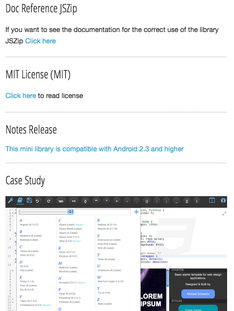 ไลบรารีขนาดเล็กสำหรับการสร้างแอปพลิเคชันมือถือ Android ไฮบริด HTML5 / Java สำหรับการบีบอัดไฟล์ในรูปแบบ Zip โดยตรงจากคอมโพเนนต์ WebView คุณสามารถบีบอัดไฟล์และโฟลเดอร์แต่ละรายการได้โดยเพิ่มอินเทอร์เฟซ DroidZip ใน JavaScript และวัตถุ ZipHTML5Hybrid ไปยังคอมโพเนนต์ WebView ของ Android โดยตรง สำหรับการใช้งานส่วนต่อประสานใน Java WebView คุณต้องรวมใบอนุญาต JavaScript ไลบรารี JSZip MIT ที่มีชื่อเสียงไว้ในไฟล์ HTML