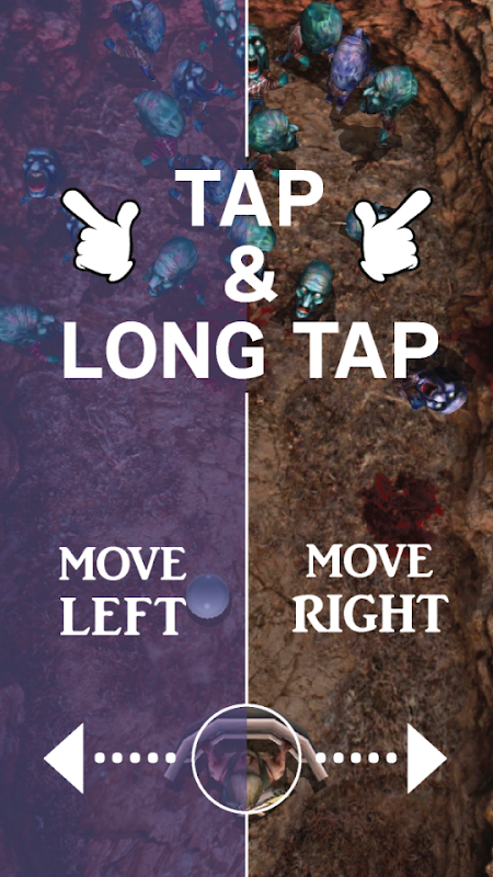 画面の右半分をタップすると主人公が右へ、左半分をタップすると左へ主人公が動きます。バリケードの角度を巧みに利用しゾンビ達を狙ってください。