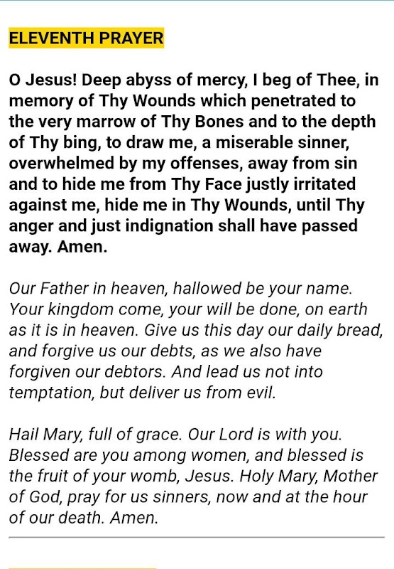 11. Let it be known that whoever may have been living in a state of mortal sin for 30 years, but who will recite devoutly, or have the intention to recite these Prayers, the Lord will forgive him all his sins.