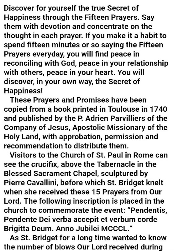 Visitors to the Church of St. Paul in Rome can see the crucifix, above the Tabernacle in the Blessed Sacrament Chapel, sculptured by Pierre Cavallini, before which St. Bridget knelt when she received these 15 Prayers from Our Lord. The following inscription is placed in the church to commemorate the event: “Pendentis, Pendente Dei verba accepit et verbum corde Brigitta Deum. Anno Jubilei MCCCL.”